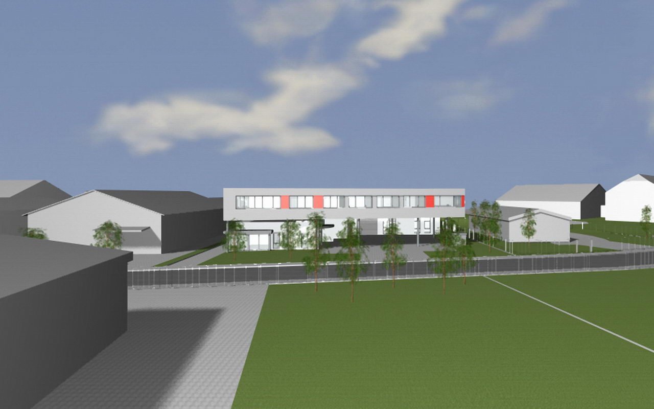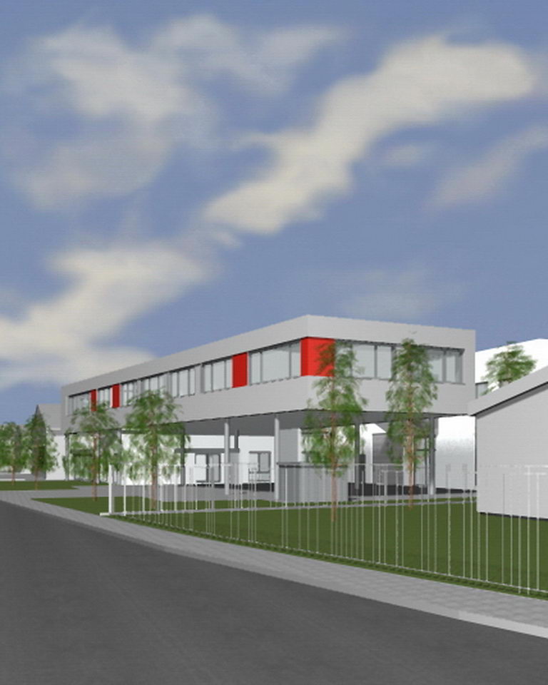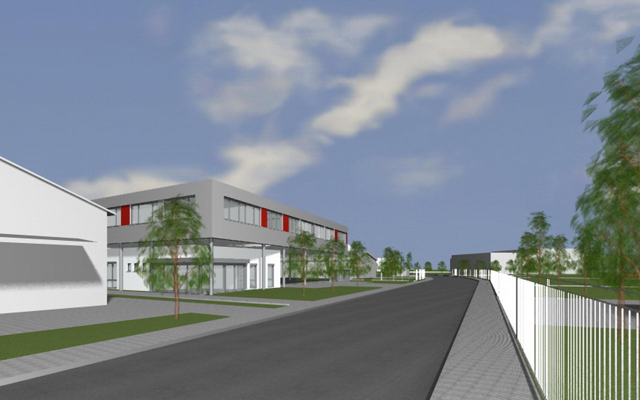 Das bestehende Büro- und Hallengebäude soll erweitert werden. Um die vorhandene LKW-Anlieferung der Produktionshallen und die notwendigen Stellplätze auf dem vorderen Hof erhalten zu können haben wir das Konzept eines „schwebenden Büroriegels“ im Obergeschoss entwickelt.