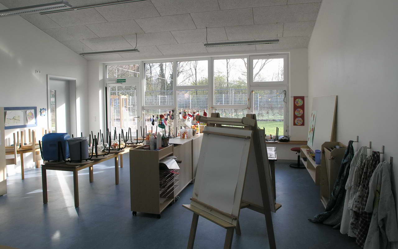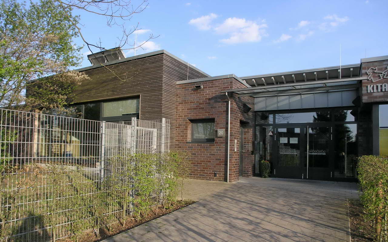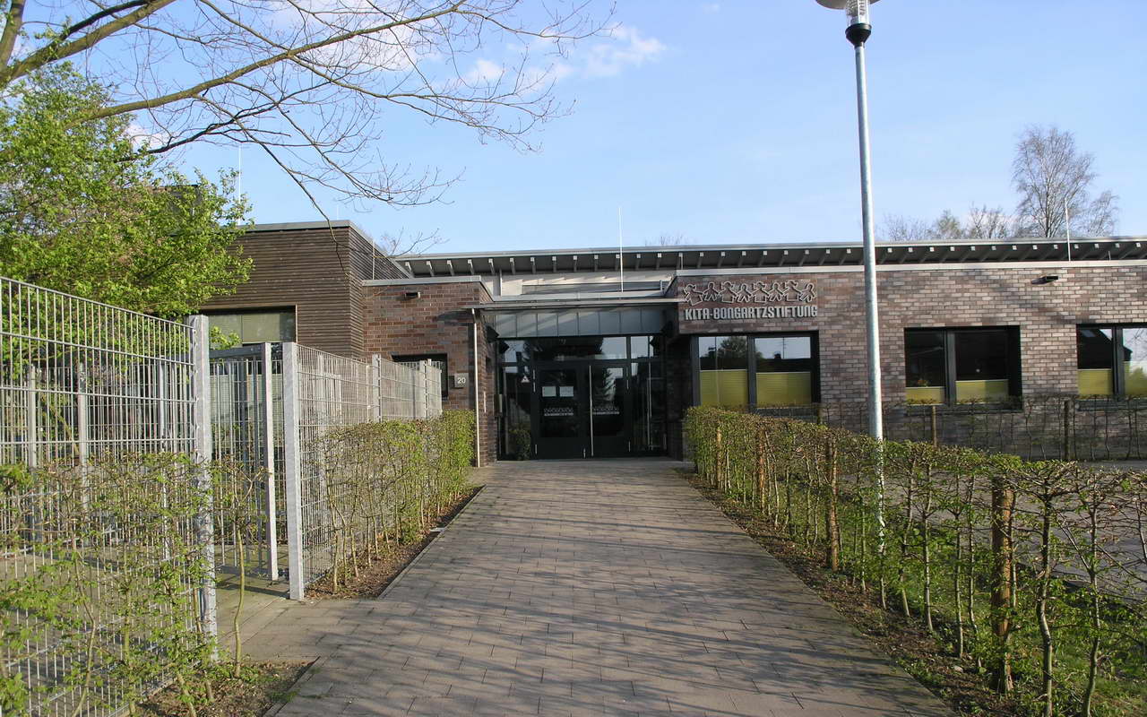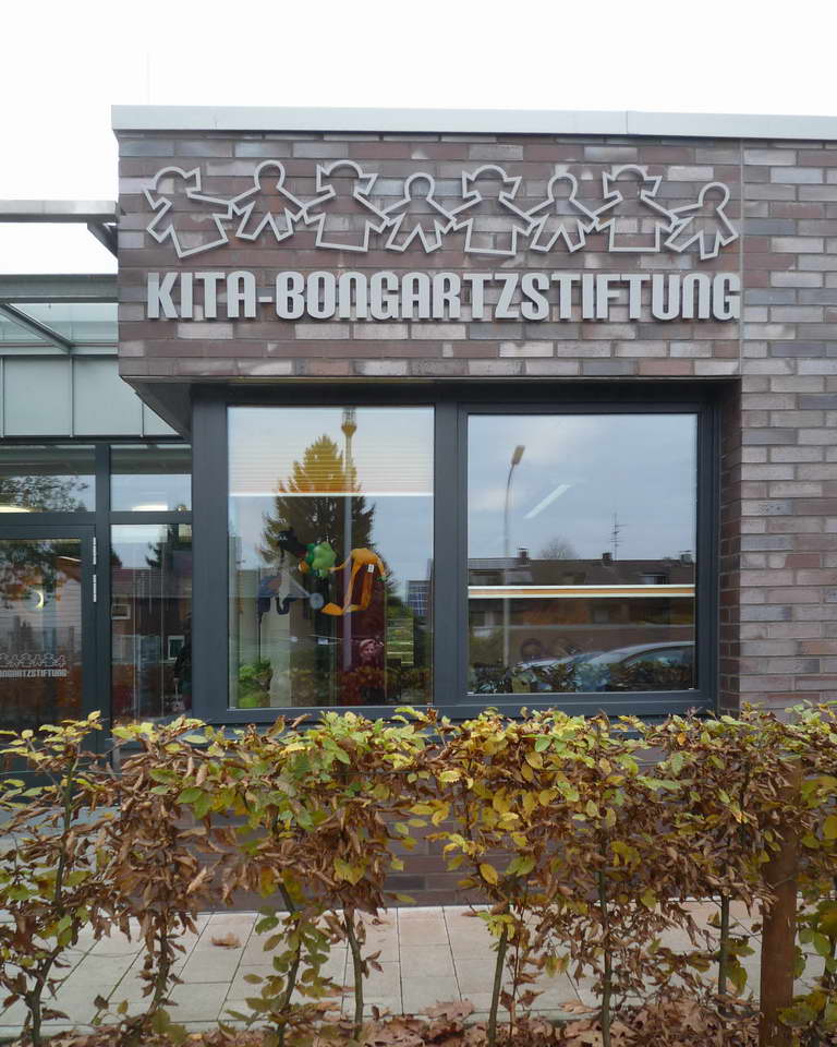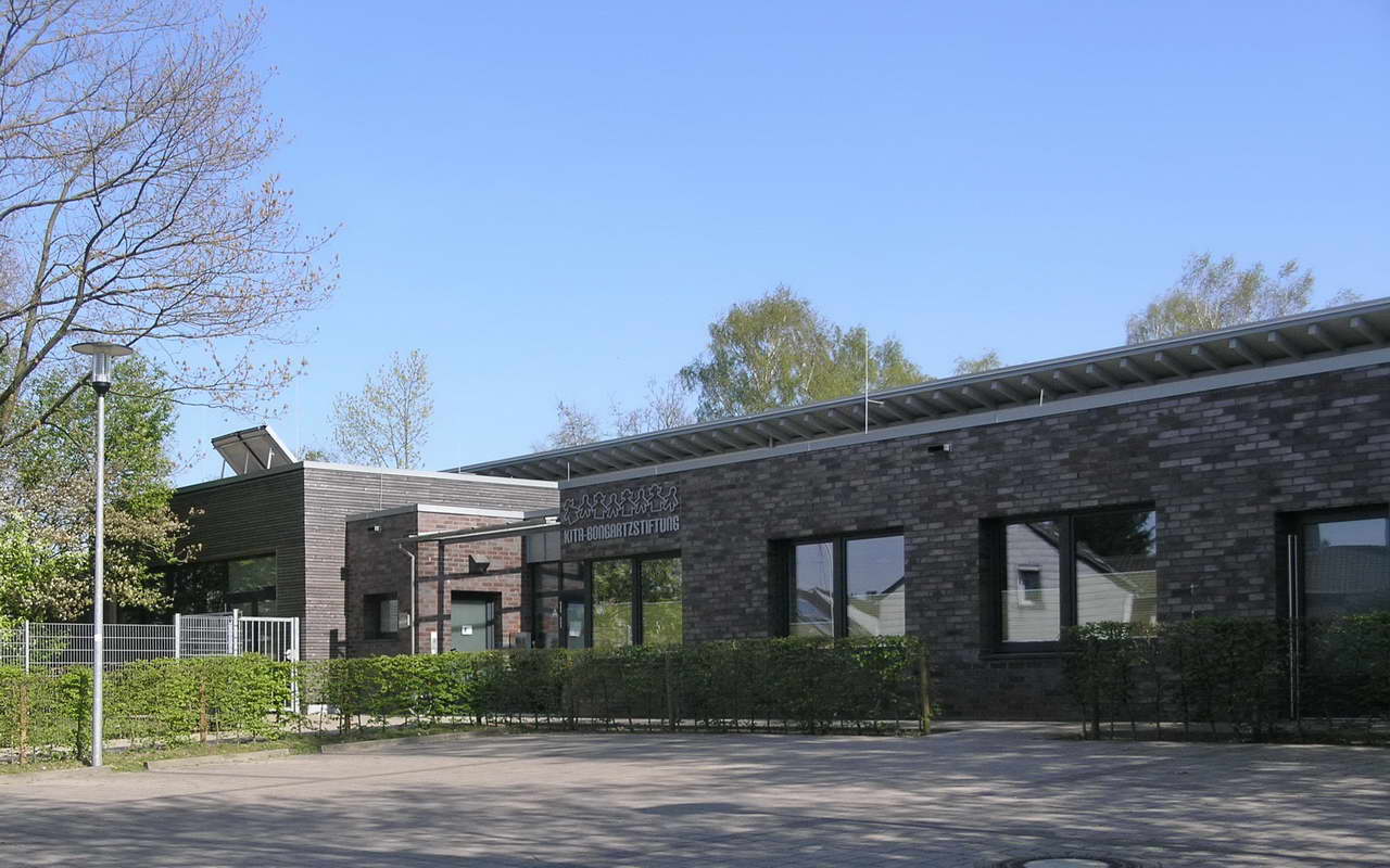 Teilnehmer am „Tag der Architektur 2011“ – Die 4-gruppige Kita Bongartzstiftung mit U3-Betreuung wurde im Herbst 2010 eröffnet. Die wesentlichen Entwurfsgrundlagen bilden zum Einen die konsequente Umsetzung einer moderneren pädagogischen Konzeption mit der Schaffung von Funktionsräumen als Themenräume wie dem Bauraum, dem Emporen-Bewegungsraum, das Atelier, das Kindercafé, die Wasserspiele, die Schmutzschleusen sowie die großzügige Eingangshalle als Spielzone mit weichen Formen und Nischen. Zum Anderen fügen sich die naturnah ausgestalteten Außenspielflächen mit dem zentral angeordnetem Amphitheater, der Matschstelle, dem Platz mit Baumateriealien und der Feuerstelle harmonisch in das mit Bäumen bestandene Grundstück ein. Die Pultdachfläche des Niedrigenergiehauses ist mit einer Indach-Photovoltaikanlage (82 kW) ausgestattet.
