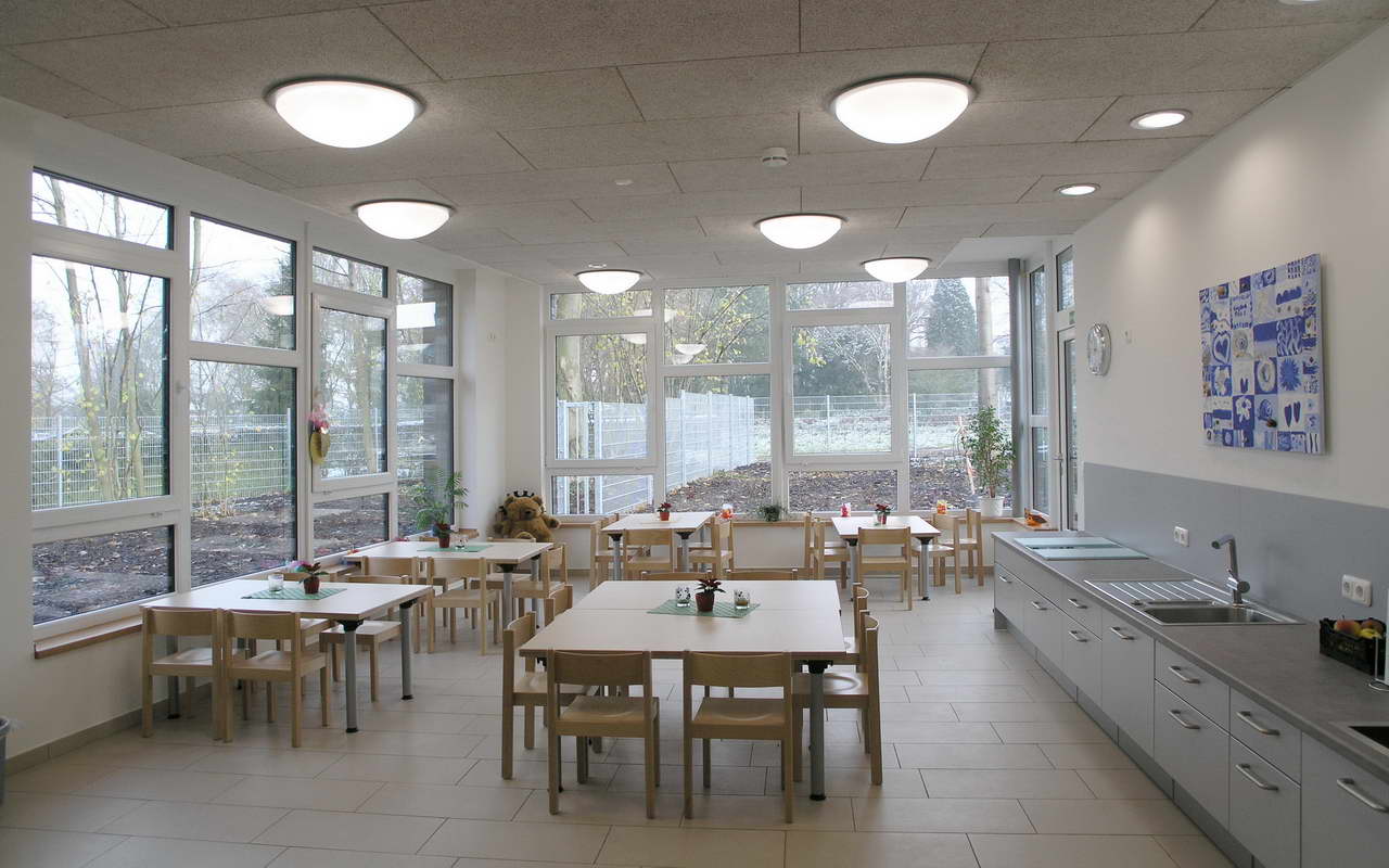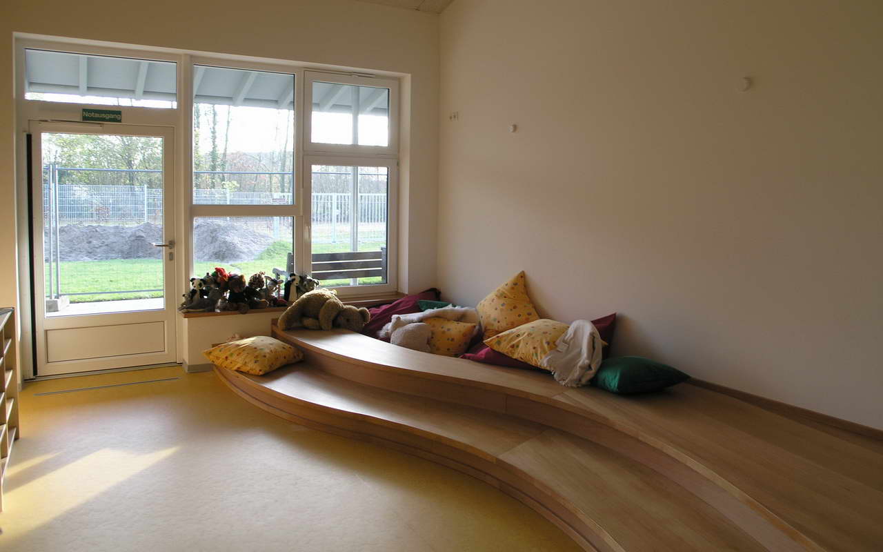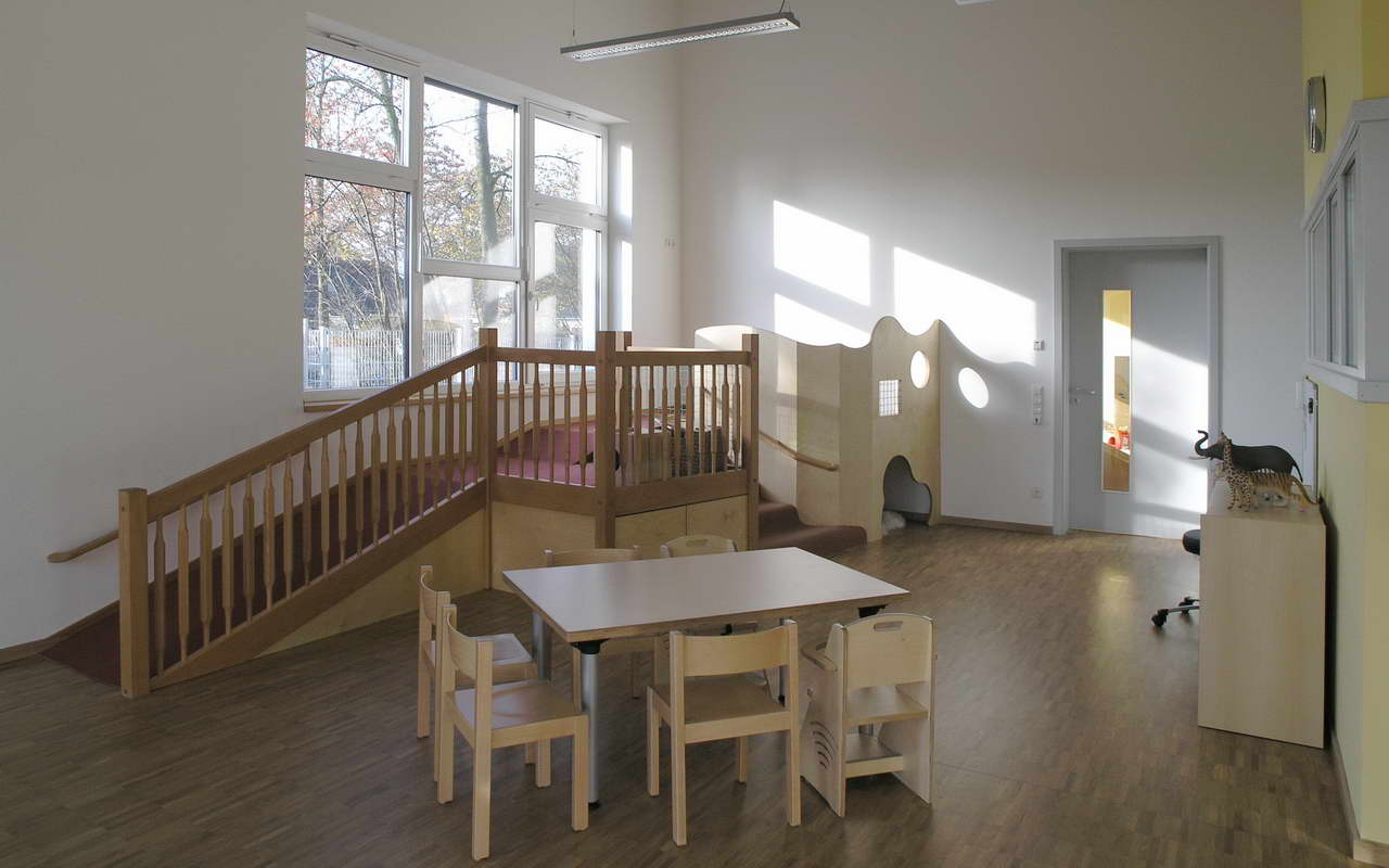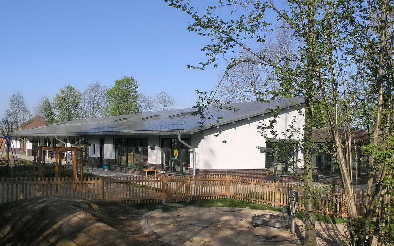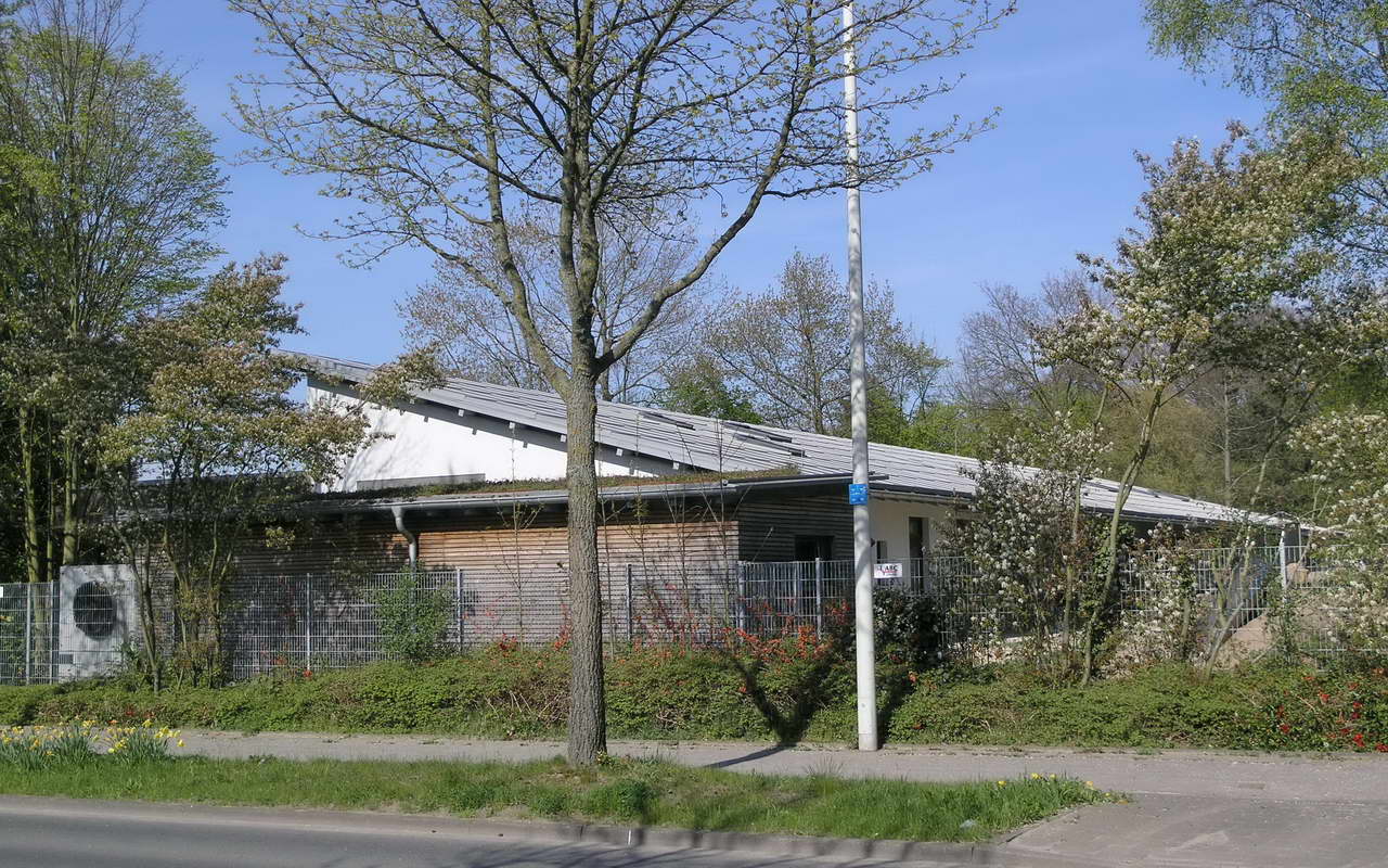 Teilnehmer am „Tag der Architektur 2011“ – Die 4-gruppige Kita Bongartzstiftung mit U3-Betreuung wurde im Herbst 2010 eröffnet. Die wesentlichen Entwurfsgrundlagen bilden zum Einen die konsequente Umsetzung einer moderneren pädagogischen Konzeption mit der Schaffung von Funktionsräumen als Themenräume wie dem Bauraum, dem Emporen-Bewegungsraum, das Atelier, das Kindercafé, die Wasserspiele, die Schmutzschleusen sowie die großzügige Eingangshalle als Spielzone mit weichen Formen und Nischen. Zum Anderen fügen sich die naturnah ausgestalteten Außenspielflächen mit dem zentral angeordnetem Amphitheater, der Matschstelle, dem Platz mit Baumateriealien und der Feuerstelle harmonisch in das mit Bäumen bestandene Grundstück ein. Die Pultdachfläche des Niedrigenergiehauses ist mit einer Indach-Photovoltaikanlage (82 kW) ausgestattet.