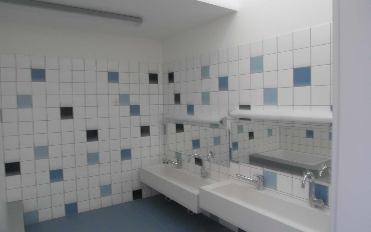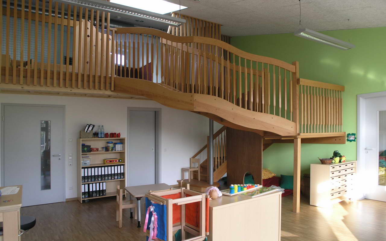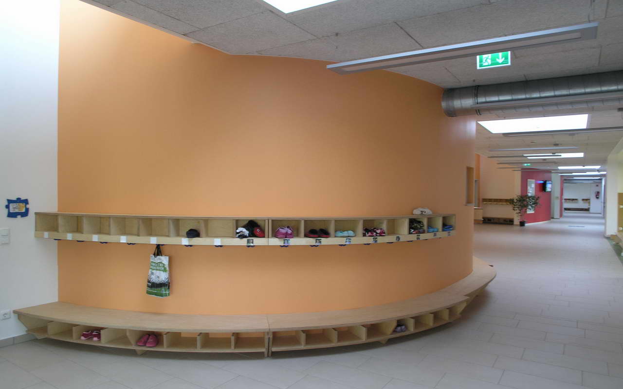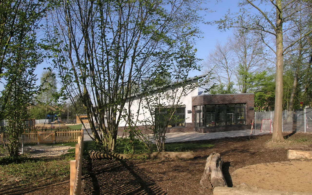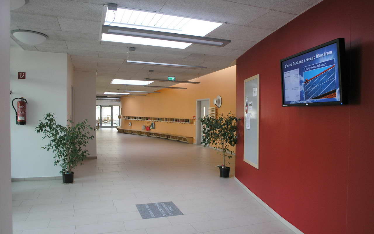 Teilnehmer am „Tag der Architektur 2011“ – Die 4-gruppige Kita Bongartzstiftung mit U3-Betreuung wurde im Herbst 2010 eröffnet. Die wesentlichen Entwurfsgrundlagen bilden zum Einen die konsequente Umsetzung einer moderneren pädagogischen Konzeption mit der Schaffung von Funktionsräumen als Themenräume wie dem Bauraum, dem Emporen-Bewegungsraum, das Atelier, das Kindercafé, die Wasserspiele, die Schmutzschleusen sowie die großzügige Eingangshalle als Spielzone mit weichen Formen und Nischen. Zum Anderen fügen sich die naturnah ausgestalteten Außenspielflächen mit dem zentral angeordnetem Amphitheater, der Matschstelle, dem Platz mit Baumateriealien und der Feuerstelle harmonisch in das mit Bäumen bestandene Grundstück ein. Die Pultdachfläche des Niedrigenergiehauses ist mit einer Indach-Photovoltaikanlage (82 kW) ausgestattet.