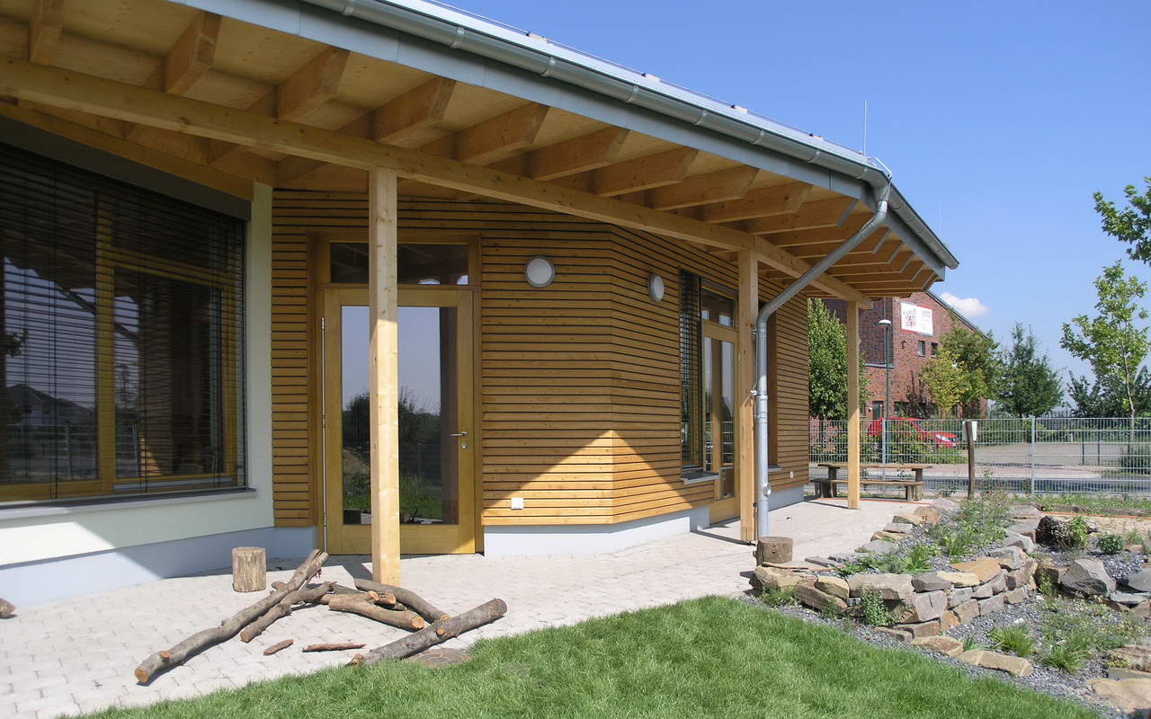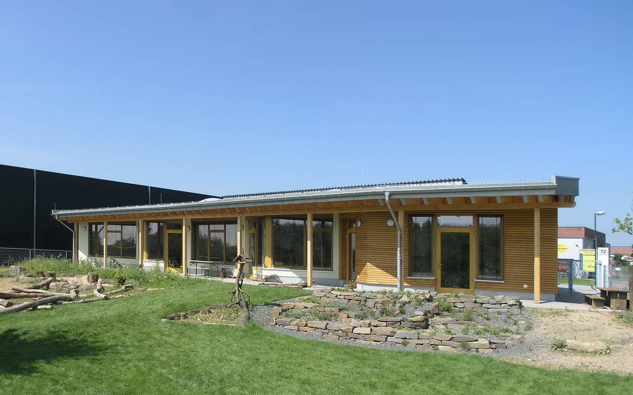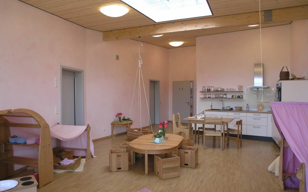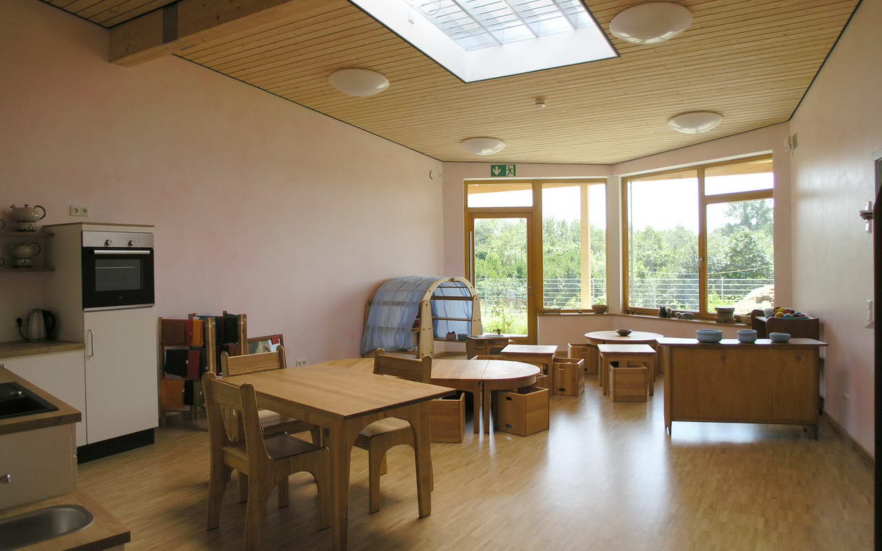 Teilnehmer am „Tag der Architektur 2015“ – Der 2-gruppige Waldorf Kindergarten wurde im Sommer 2014 eröffnet. Die Entwurfsideen bilden zum Einen die konsequente Umsetzung einer moderneren pädagogischen Konzeption mit der Betreuung von Kindern unter 3 Jahren und zum anderen die Verwendung von vielen natürlichen Materialien und das spannende Spiel mit direkter und indirekter Belichtung. Der naturnah gestaltete Außenbereich lädt zum Spielen ein. Die Technik des Gebäudes ist energetisch optimiert durch den Einbau eines Micro-BHKWs, welches neben der Wärmeversorgung für die Fußbodenheizung und Warmwasser gleichzeitig Strom für die Eigenversorgung erzeugt.