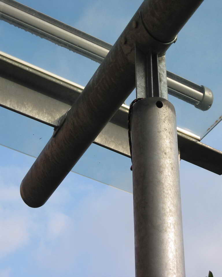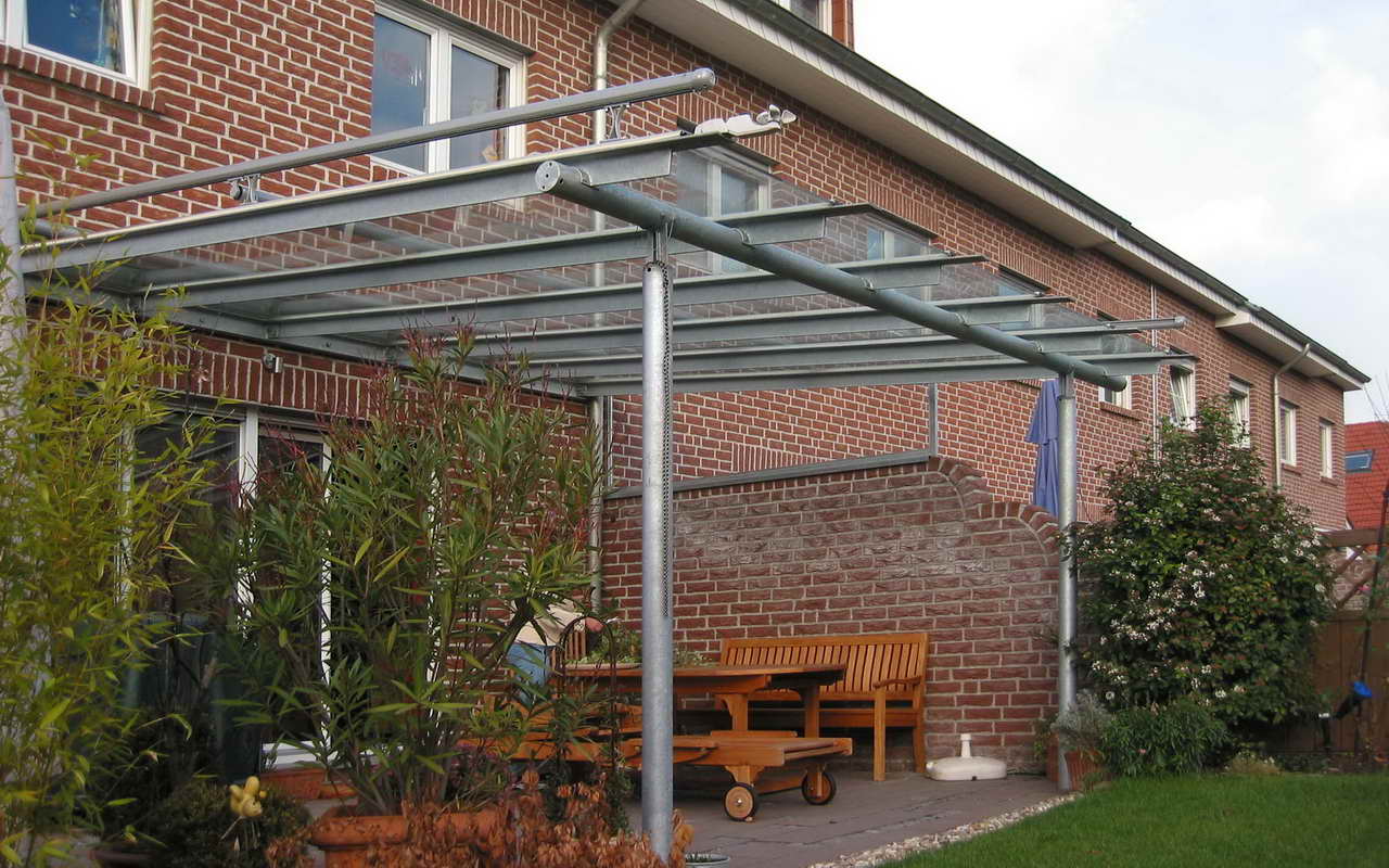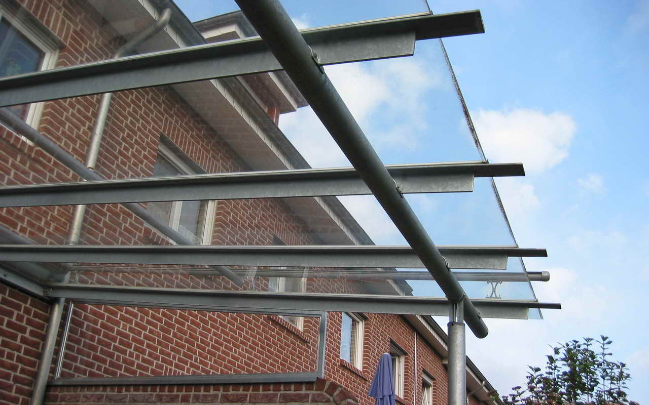 Die nachträglich angebaute Glasüberdachung der Terrasse zeichnet sich durch eine filigrane Stahlkonstruktion aus. Die wenigen Stützen und die schmalen Träger aus T-Profilen ermöglichen eine größtmögliche Transparenz, so dass sich die Belichtungssituation des Wohnraumes kaum verändert hat. Zur Verschattung ist über dem Glasdach ein textiler Sonnenschutz angebracht, der sich bei Bedarf elektrisch herausfahren lässt.