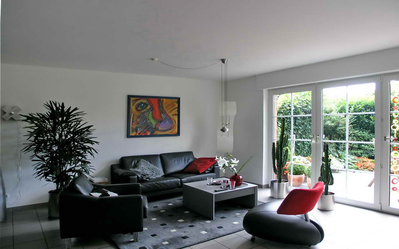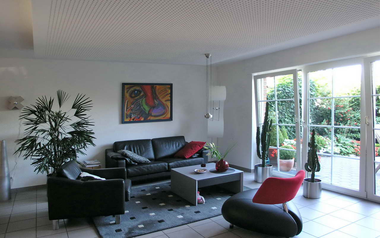 Mit dem nachträglichen Einbau der Akustikdecke wird der ehemals sehr hallige Wohnraum in einen Raum mit einer angenehmen Raumakustik verändert. Die zu große Halligkeit, verursacht durch zu viele "schallharte" Wand-, Decken und Bodenflächen, führte bisher zu einer schlechten Sprach- und Musikverständlichkeit. Sowohl der akustische als auch der optische Gesamteindruck des Wohnraumes wird durch das neue schwebende "Deckensegel" aus gelochten Gipskartontafeln, mit abgestaffelten Rändern und schallschluckenden Akustikauflagen noch weiter abgerundet.